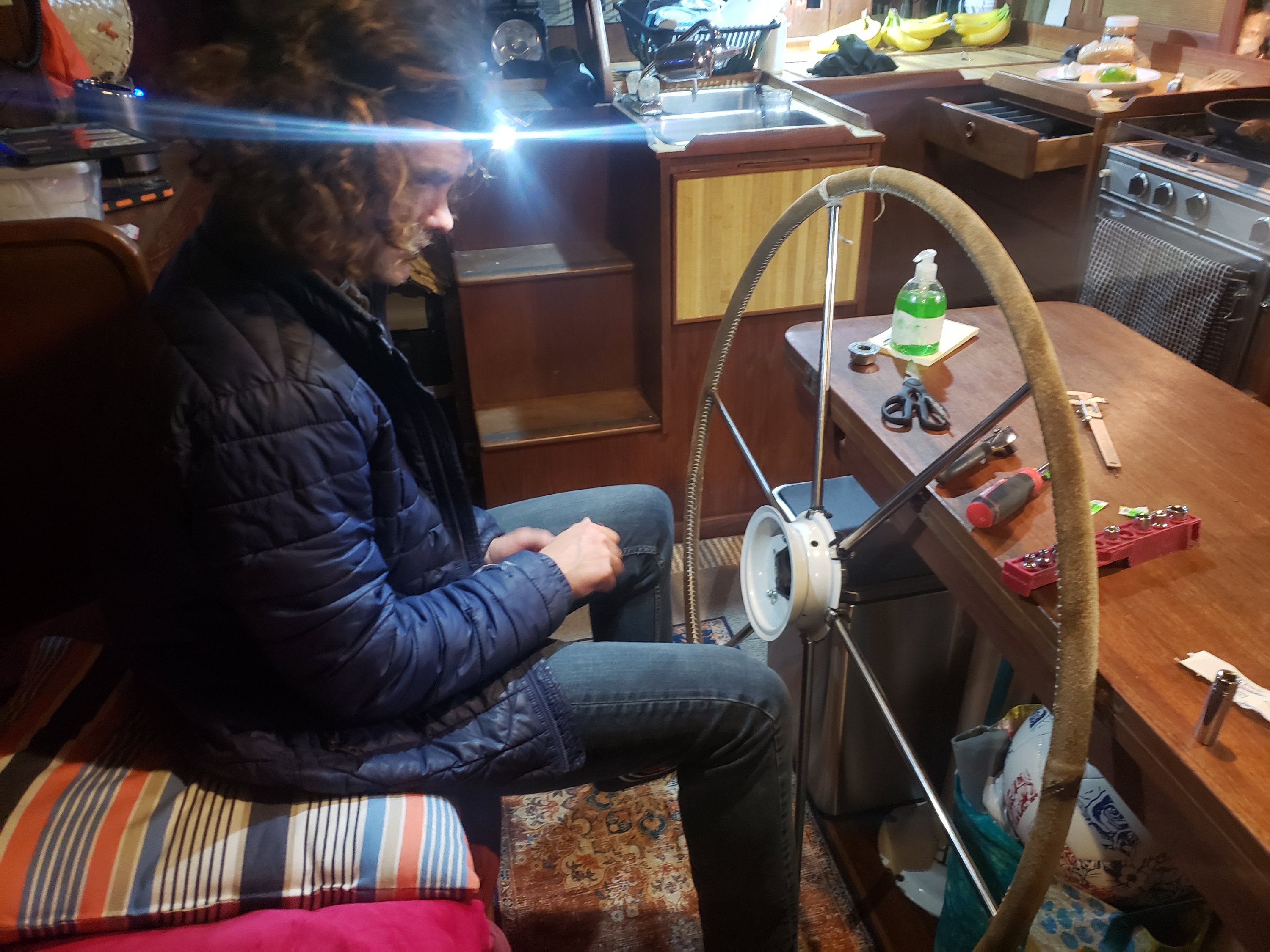 I busied myself with preparing for what I hope will be our first overnight voyage since we left, walking about 2 miles to the nearest auto shop to get a new oil and coolant change for Mr. Perkins, some bungee chords, and an inner tube for our gybe preventer (thanks Mike!).
