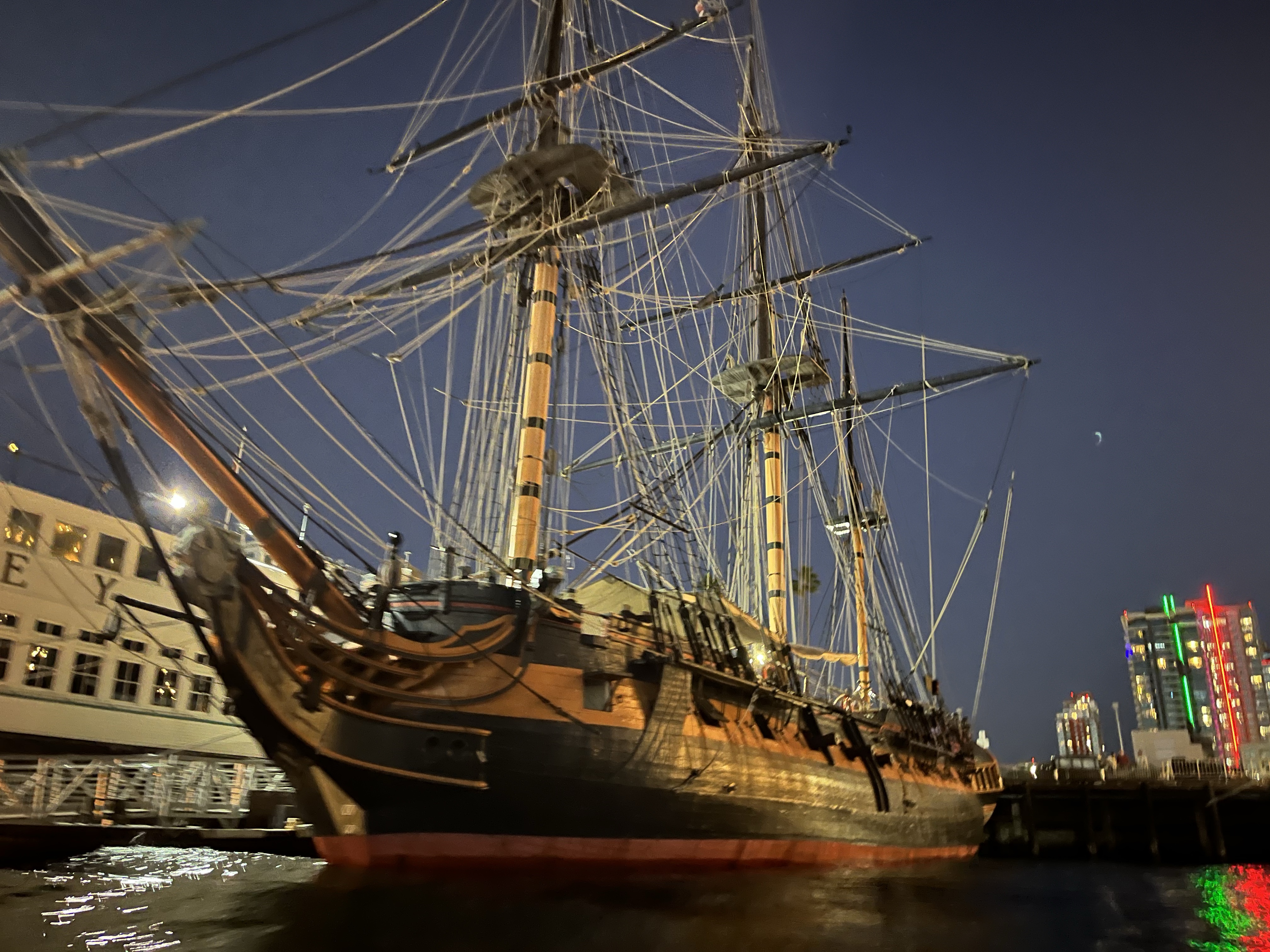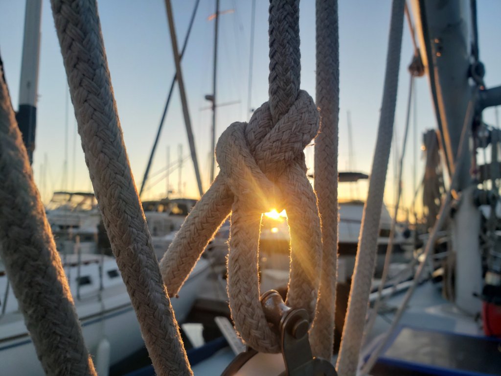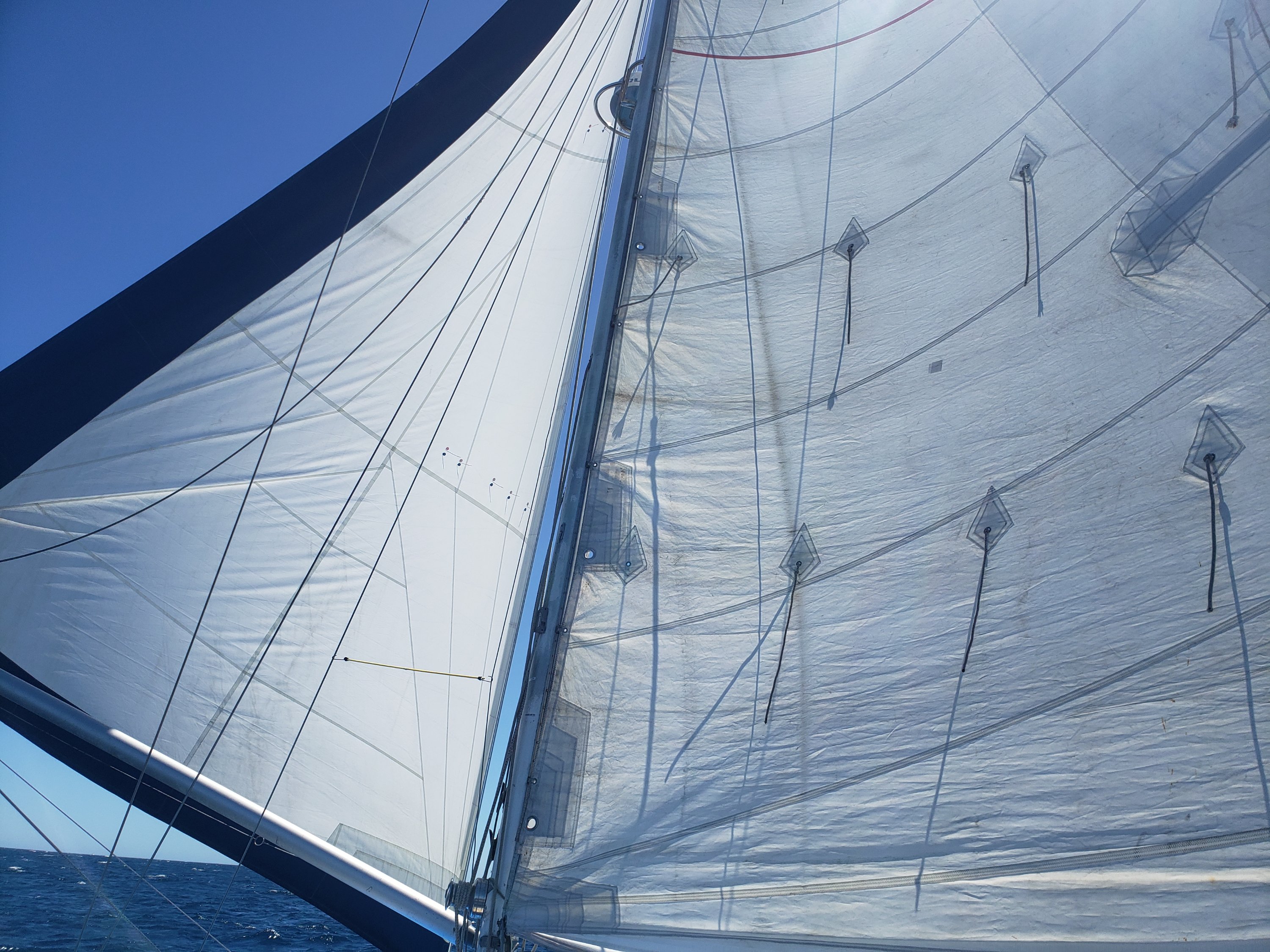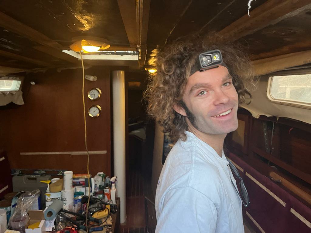 Putting the boat back in the water after a month on the hardA man and his sewing machine -Thatcher sewed a ladder to climb the mast